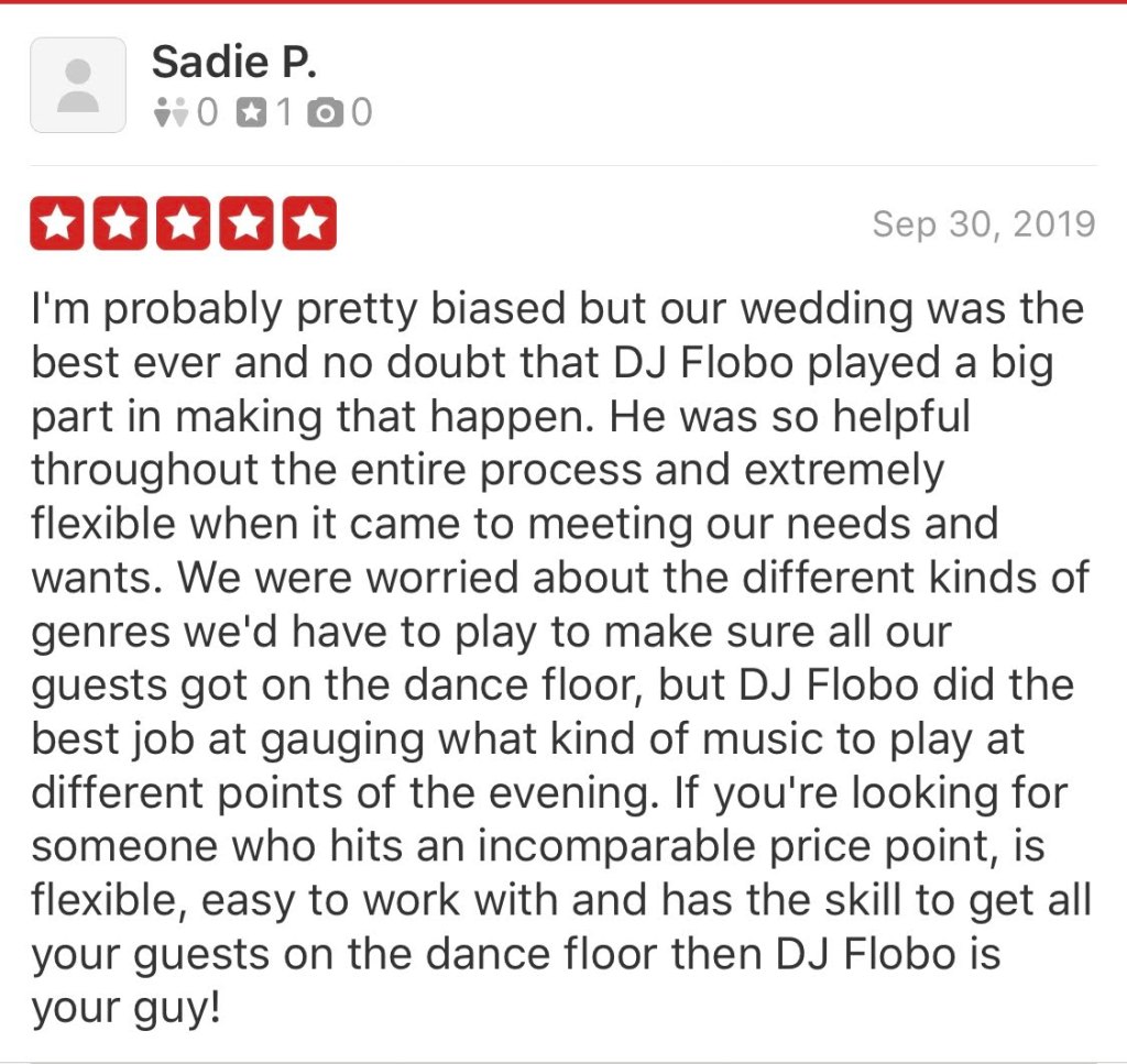 I’ve been lucky enough to be a live entertainer (whether DJing, MCing, or Comedy) for a while now. I can tell you that getting positive feedback always brings a smile to my face. Here are some recent reviews I’ve received on Yelp!
