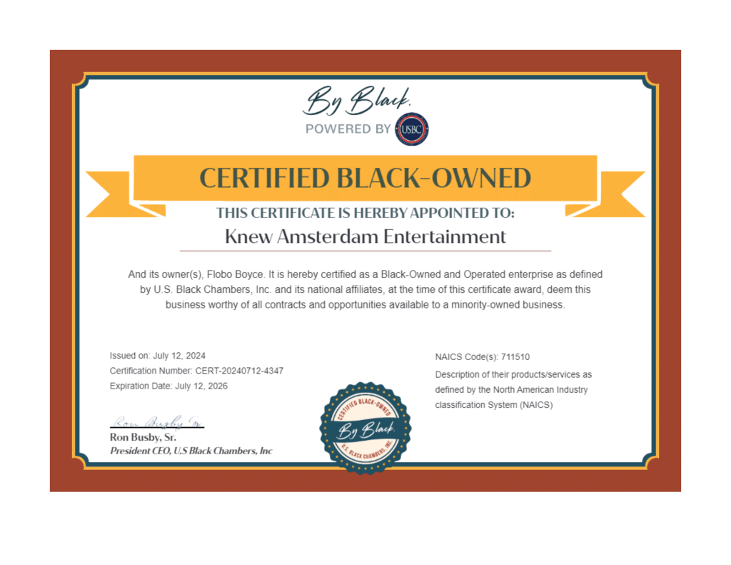 Over the past few weeks, I have been able to officially register my company, Knew Amsterdam Entertainment as a certified minority-owned business. While I’ve been told by my contemporaries that this would open the business to future opportunities, I am proud for a whole other reason.
